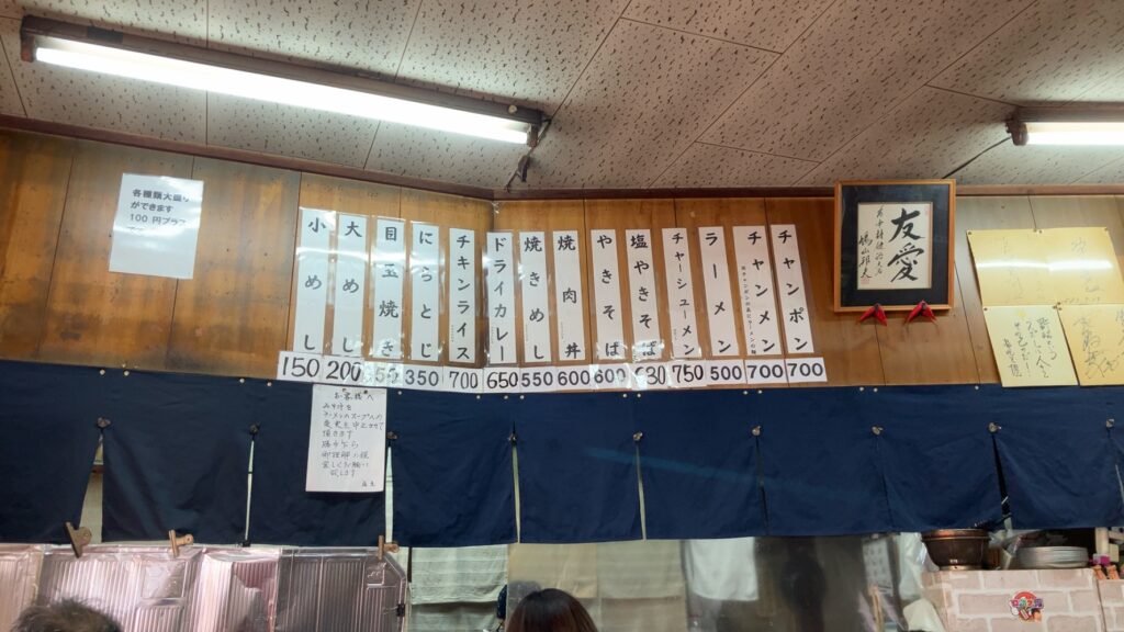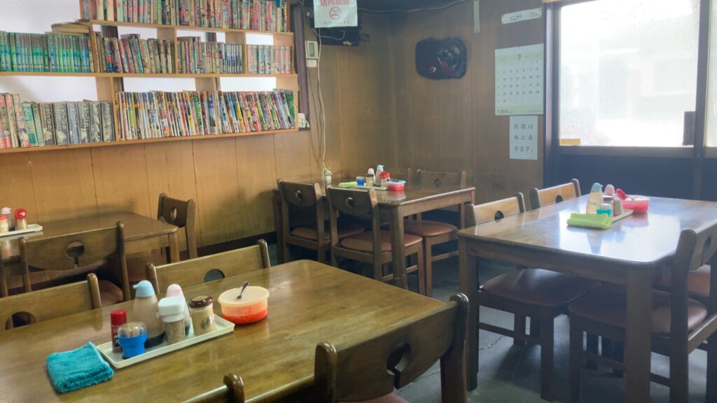 筆者が30年近く前からお世話になっている食堂ですが、テーブル椅子の配置や戸棚の漫画など変わっていないように思えます。