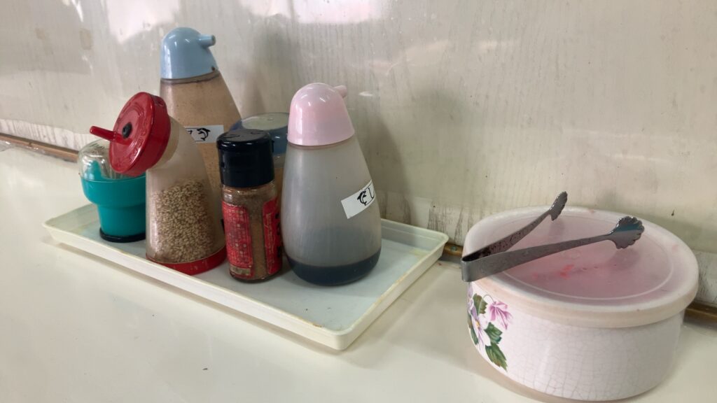 卓上には紅生姜や醤油、ゴマなどの調味料があります。