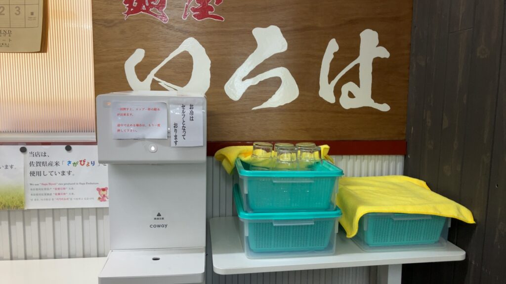 お冷はセルフとなっており、浄水機は1回ボタンを押すと、コップに適量入るタイプ。